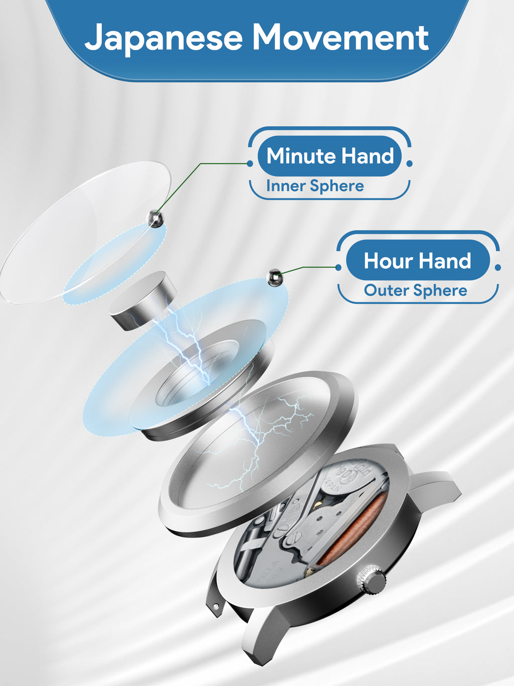 The dial of the magnetic watch incorporates the design style of Japanese Zen gardens, featuring a minimalist design with dual magnetic balls indicating the time. Outer sphere=hour, Inner sphere=minute, ensuring both accuracy and stability in timekeeping.