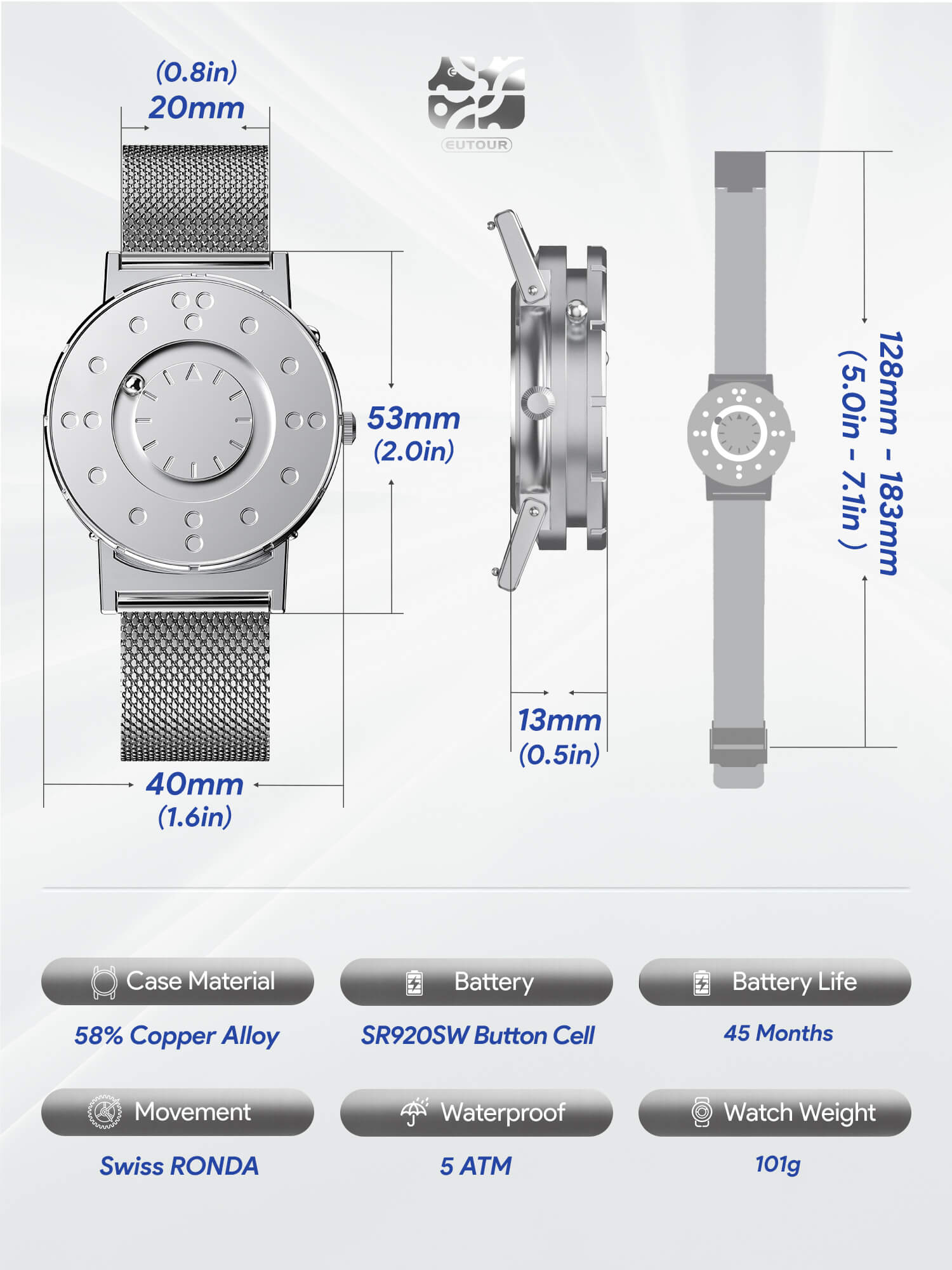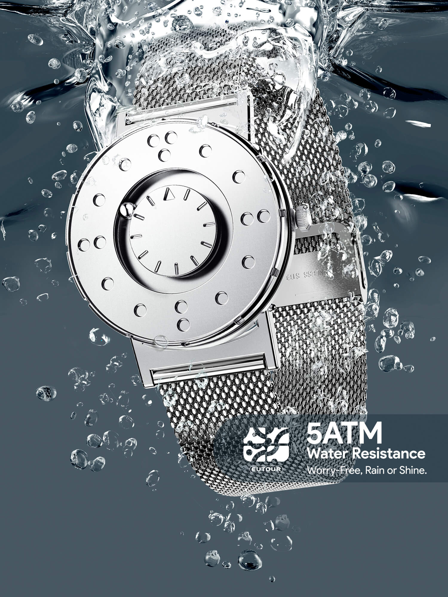 A6:All EUTOUR watches are designed for daily water resistance, suitable for hand washing or rain. However, specific waterproof ratings vary by collection. You can find the precise ATM rating for this model in the 'Specifications & Materials' section on this page.