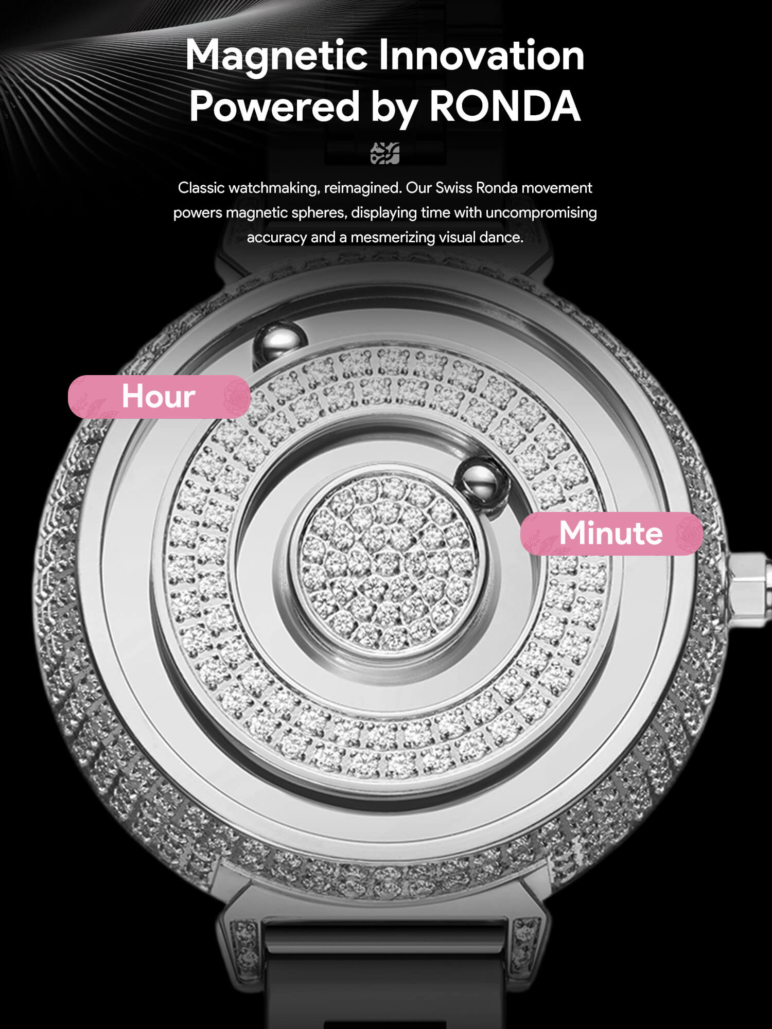 This fashionable and luxurious women's magnetic watch features a minimalist design with a dazzling crystal embedded in the center of the dial, adding a touch of luxury and sophistication. It also revolutionizes the design of traditional analog watches by indicating time through the movement of two magnetic balls, making it the perfect choice for women's fashionable accessories.