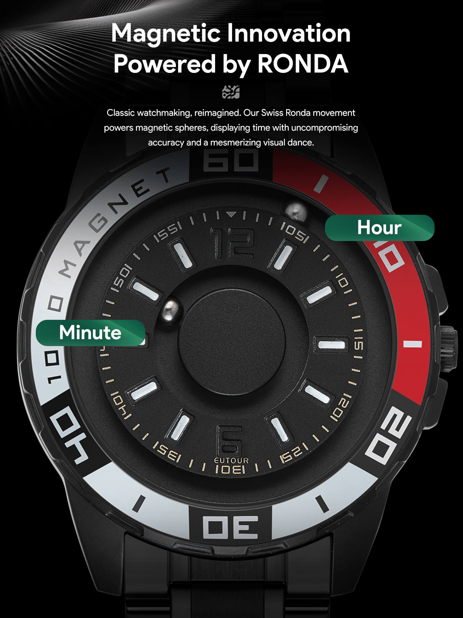 Driven by magnetic technology, EUTOUR's magnetic watch uses two magnetic balls instead of traditional hands to move along the track on the dial. This unique design sets the watch apart, showcasing exceptional taste and effortlessly becoming the new fashion favorite on your wrist.