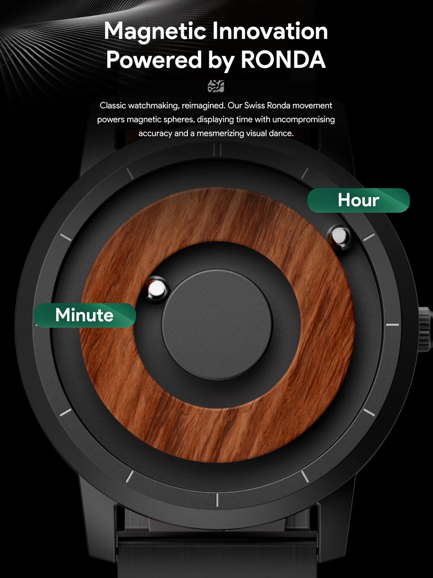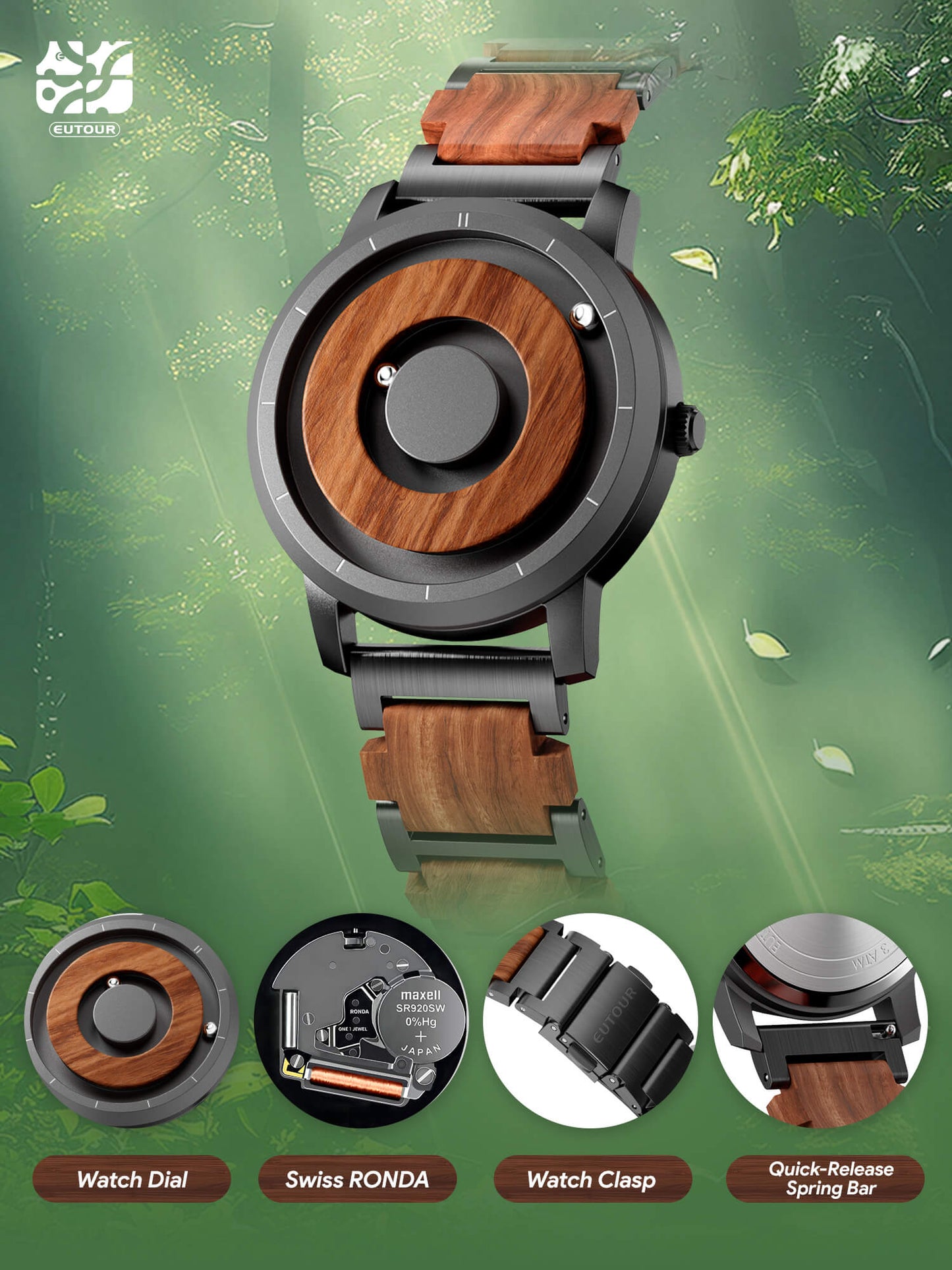 Driven by magnetic technology, EUTOUR's magnetic watch uses two magnetic balls instead of traditional hands to move along the track on the dial. This unique design sets the watch apart, showcasing exceptional taste and effortlessly becoming the new fashion favorite on your wrist.