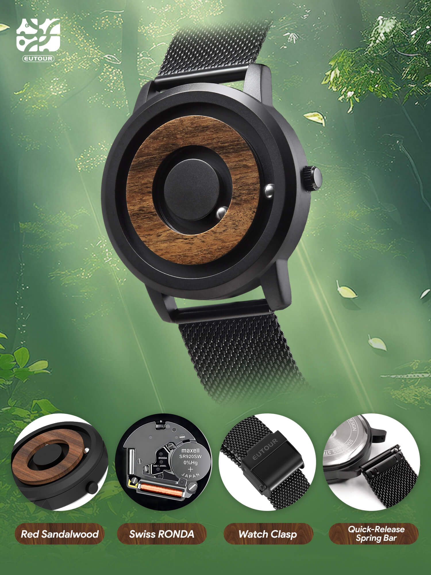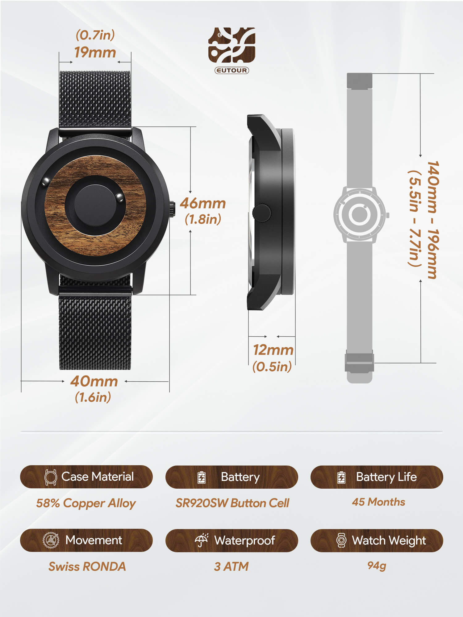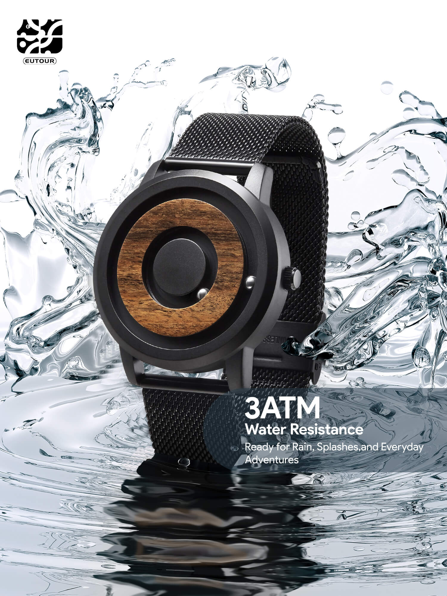 Our EUTOUR watch with magnetic balls adopts vacuum plating technology, eco-friendly. Covered with IF film, it enhances dust, oil, fingerprint, and scratch resistance. Additionally, it boasts waterproof performance compliant with the 3ATM standard, allowing for daily handwashing without affecting performance. (Please note, to avoid damage, it is not recommended to wear it while bathing, swimming, or soaking in water for extended periods.)